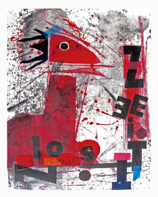 Seit 2017 entstehen in meinem Atelier in Esens immer mehr sogenannte Druck-Collagen. Ich nehme dafür Druckfarben, Schablonen, Walzen und Holzbuchstaben und ergänze meine Arbeiten spielerisch mit Holz-schnitten und Zeichnungen …