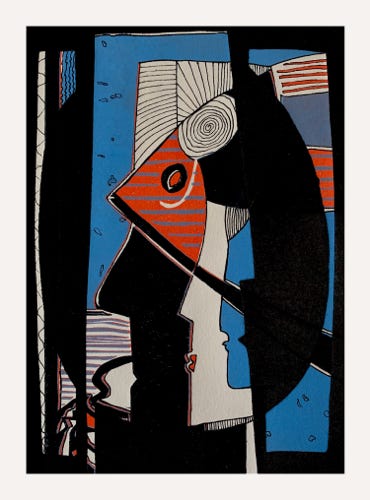 Durch das Überdrucken von Papierarbeiten und älteren Holzschnitten mit einem abstrakten Kopf als Holzschnitt erhalte ich spannende Unikate. Die unterschiedlichen Hinter-gründe und Strukturen ergeben immer neue Einblicke…