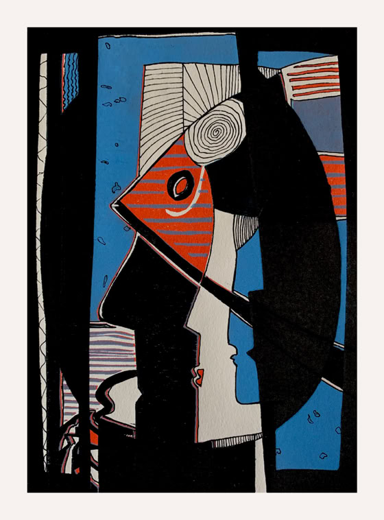 Durch das Überdrucken von Papierarbeiten und älteren Holzschnitten mit einem abstrakten Kopf als Holzschnitt erhalte ich spannende Unikate.