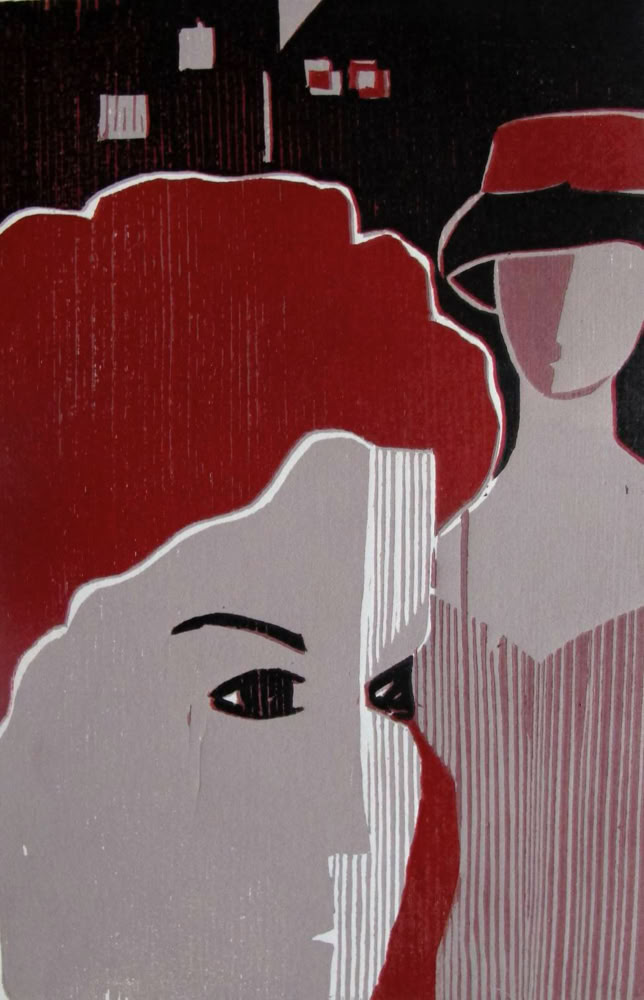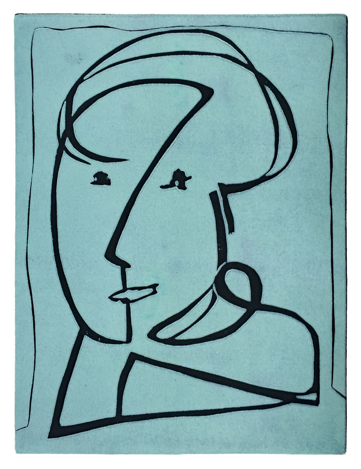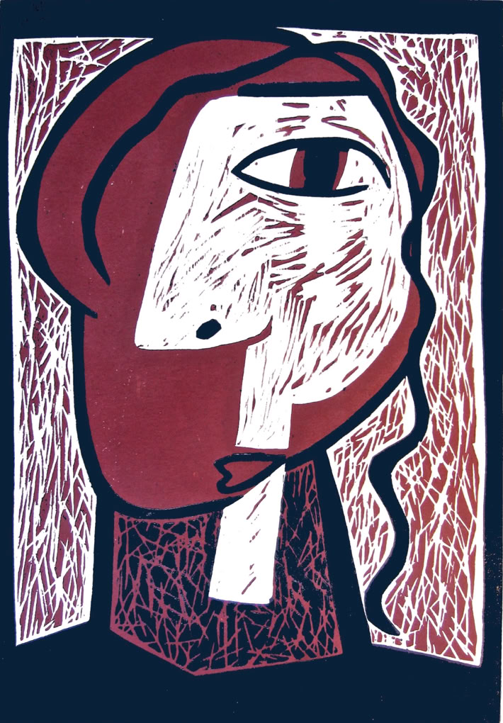 Ein weitere Herausforderung ist die Reduzierung der Linien, um so sparsam wie möglich mit wenigen Schwüngen ausdrucksstarke Portraits zu drucken. Man erkennt oftmals nicht, ob es sich um zwei Gesichter handelt oder um eine Person, im Dialog mit sich selbst. In Farbholzschnitt Eins-Zwei-Drei entdeckt man zeitweilig bis zu drei Gesichter.